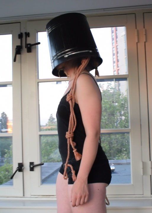 (II) This reveals a second bucket on B's head; smaller and silver and another rope attached and dangling. One moment of adjustment to this new situation, B slowly grabs the rope and hits the bucket the same manner as before. Uneven at first, more firm later on.