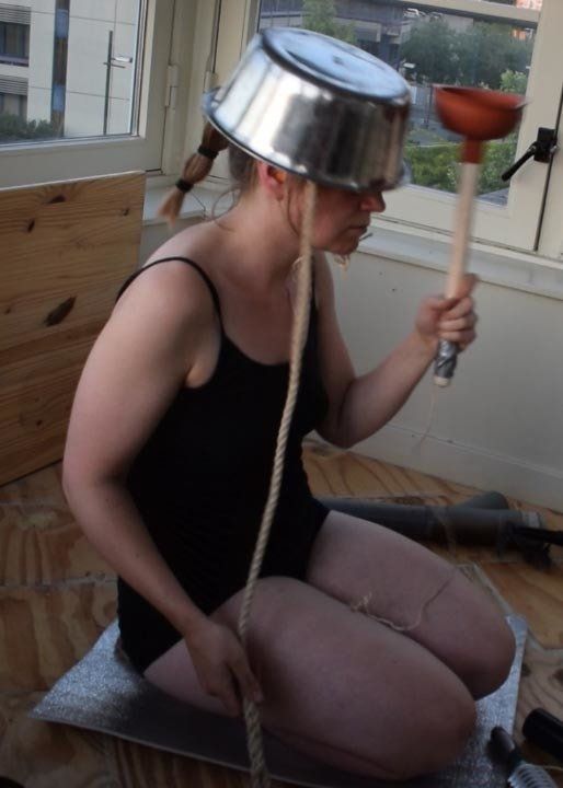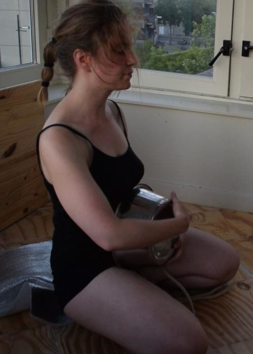 (I) When sitting down, Berendine (B) is not present. Then, some metal clanging sounds emerge, rhythmically. Slowly entering the room, B has a black metal bucket on her head with a hanging rope, attached from the inside. With this rope she hits the bucket in repeated action. Crescendo in movement and sounds, until the bucket is thrown off on the ground.